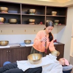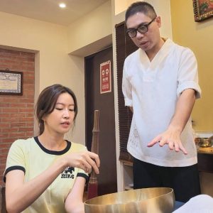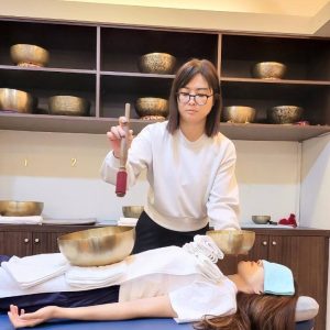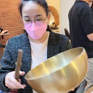 由於她對話中帶著不安與慌張,在慢慢穩定下她的情緒與她詳談後,才知道她嘗試了各式各樣的方式想要幫助她先生,講著講著便紅了眼框,於是我們用頌缽慢慢引導她回到自我的內在中心,也跟著沈澱放鬆自己的身體以及心情。