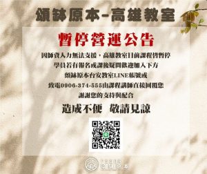 發佈於 2023 年 6 月 15 日 作者: pssbrbowl『頌缽原本|高雄教室暫停營運公告』 因師資人力無法支援,高雄教室目前課程皆暫停,學員若有報名或課後疑問歡迎加入下方「頌缽原本台安教室」Line帳號,或致電0906-374-555,由課程講師直接回覆您 謝謝您的支持與配合 #頌缽原本 #閱讀心靈療癒推廣中心 相關