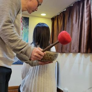 在經驗豐富的老師教學引導下,讓學員在一天內就能掌握頌缽、聲波療法等基礎概念,循序漸進地了解敲缽、磨缽等實作方法。課堂結束前再將一日所學互相施作。