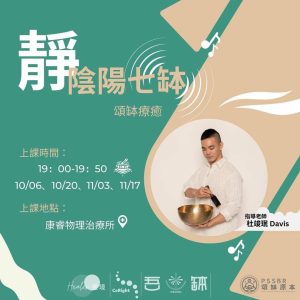 本課程將透過『陰陽七缽組』敲擊出和諧缽音,加上不同主題的催眠引導詞,讓您進入極深層的放鬆狀態,身體與心靈獲得深層的調整與淨化,使脈輪能量恢復平衡運作,由內而外的產生自我療癒的效果。